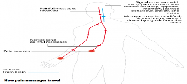 The brain sends signals back to the spinal cord, which can, in turn, either reduce or increase the pain further. Cells at the nerve endings, in the spinal cord and in the brain can become over-sensitised as a result of constant pain input. This is called ‘wind-up’ and is one of the reasons why persistent pain does not go away easily, even if the cause of the pain is discovered and treated. In simple terms, the body’s warning system becomes more sensitive, producing an increased feeling of pain even though there may no longer be any continuing damage to the body.