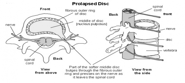 When you have a prolapsed disc (commonly called a slipped disc), a disc does not actually slip. What happens is that part of the inner softer part of the disc (the nucleus pulposus) bulges out (herniates) through a weakness in the outer part of the disc. A prolapsed disc is sometimes called a herniated disc. The bulging disc may press on nearby structures such as a nerve coming from the spinal cord. Some inflammation also develops around the prolapsed part of the disc.